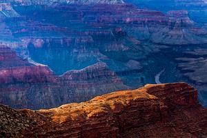 Some of Arizona's Grand Canyon ridges, crags, and the Colorado River provide a colorful but rough and broken landscape. This shot is from the South Rim at Hopi Point, looking west, with the rock formation "The Alligator" in the foregorund.